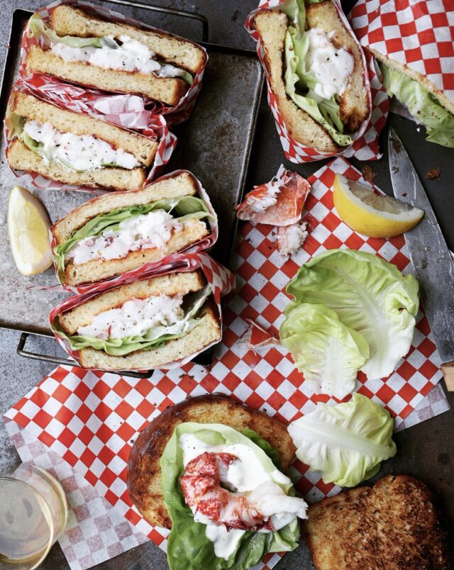 Verdeel de sla en het kreeftenvlees over de broodjes, doe er een klodder mayonaise overheen, wat citroensap en een flinke draai peper.