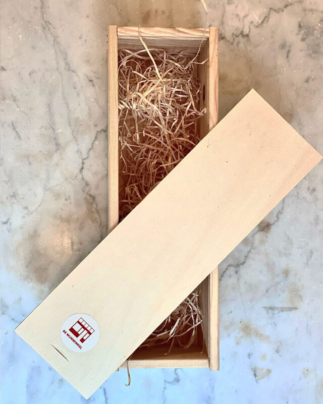 Ideal as a gift, this wooden wine case for 1 bottle with a sliding lid.