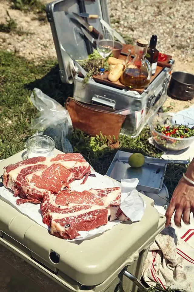 • Grease the Côte de Boeuf with olive oil and sprinkle generously with sea salt. Make sure you have a thick layer of glowing coals under your grill. You should not be able to keep your hand above the grid for more than 4 seconds. Place the meat with a bunch of thyme on top of the grill until the meat releases itself from the grill, then turn it over and grill the other side for another 5 to 7 minutes. Cook for another 5 to 10 minutes on the side of your grill until the outside feels firm like the palm of your hand. Wrap the meat in aluminium foil and leave to rest for at least another 10 minutes. Decorate the plates with a generous spoonful of the vegetables. Cut the cote de boeuf crosswise into slices about ½ cm thick. Give everyone a couple of slices and wrap the meat again to keep it warm.